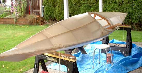 It's been a 4 day push to get the skin on, sewn up, and not painted. After 3 coats of oil based polyurathane, we have a boat. I'll finish the coaming and let the whole thing dry a few days. The acid test is coming soon!