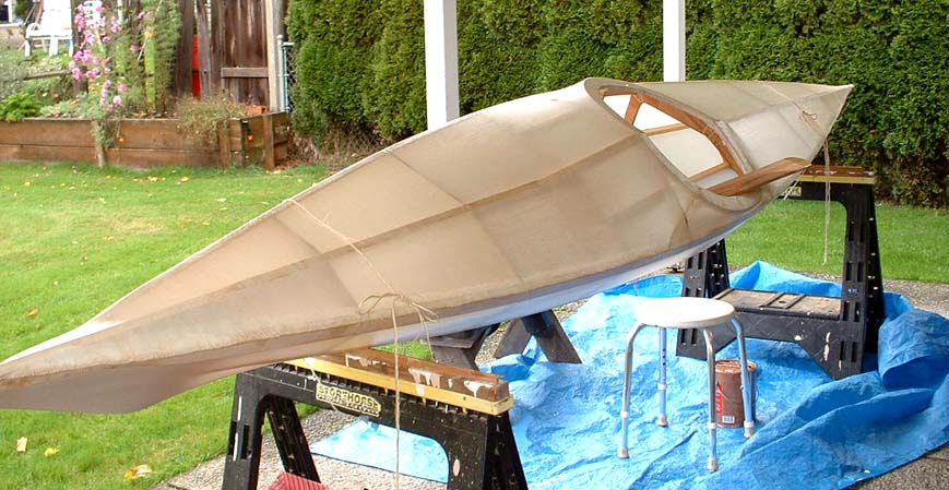 Finally painted, the 'yak now needs the coaming. And, oh yes - I have to get racks for my car because I have no way to get it to the water! Notice the twine tying the kayak to the saw horses. The boat just looks so darn fast that it should be tied down. ;-)