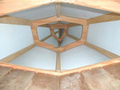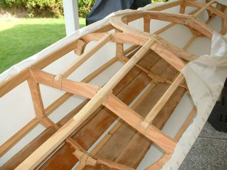 As I was starting to skin the deck it was plain to see that the part right in front of the coaming was not going to lay right. A quick fabrication of a new piece lashed into place saved the day. Interesting the flexibility in this type of construction.