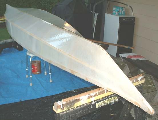 It's been a 4 day push to get the skin on, sewn up, and not painted. After 3 coats of oil based polyurathane, we have a boat. I'll finish the coaming and let the whole thing dry a few days.